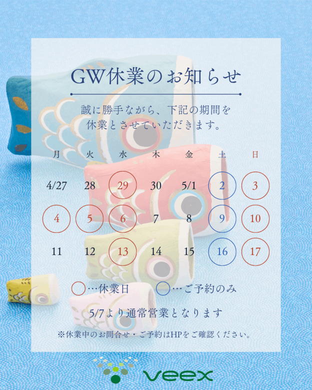 ※4/30(木)、5/1(金)、5/2(土)は通常通り営業いたします。